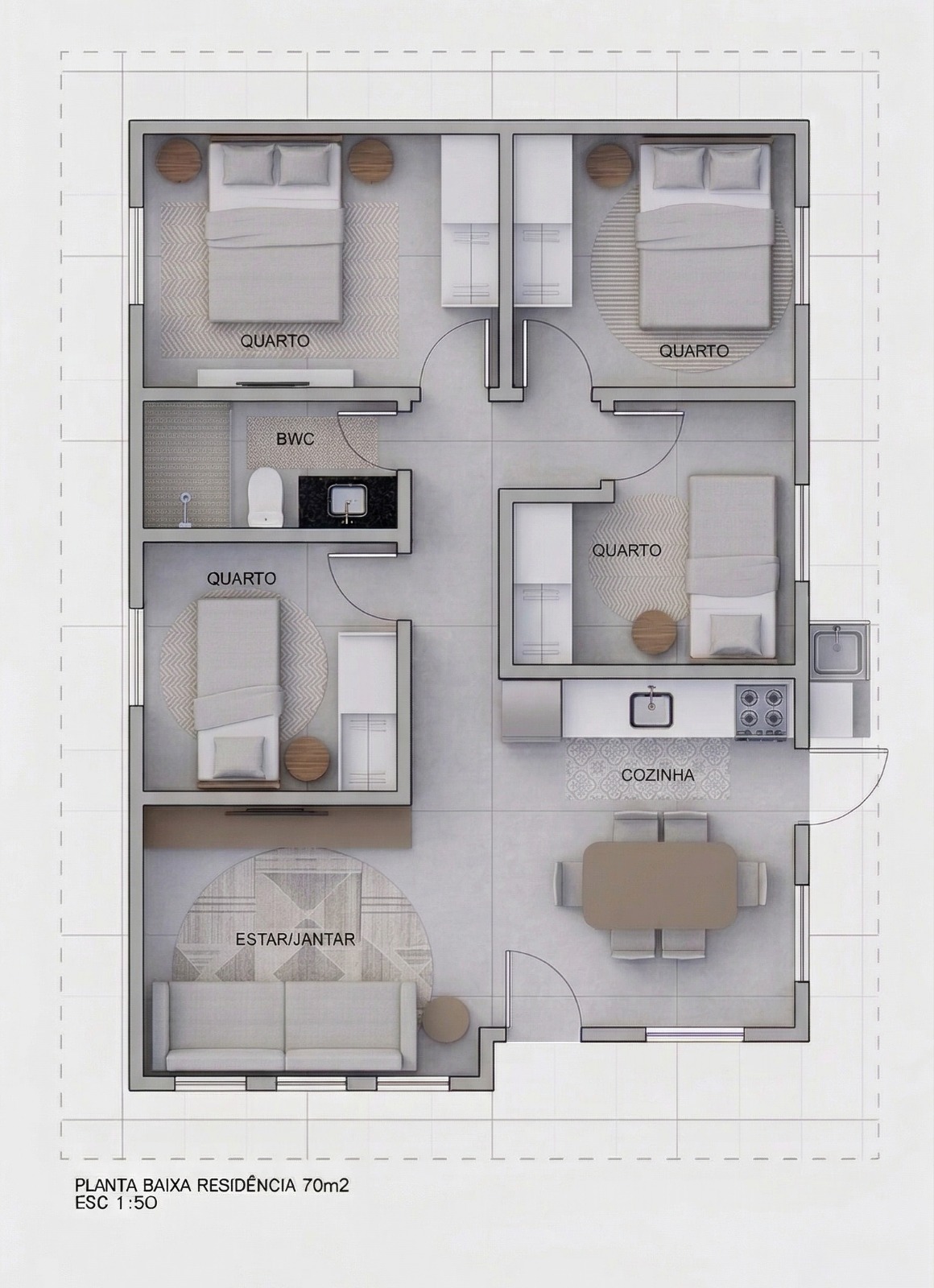 Casa de 4 quartos sala conjugada cozinha banheiro e lavanderia na parte de fora coberta com 70m2.